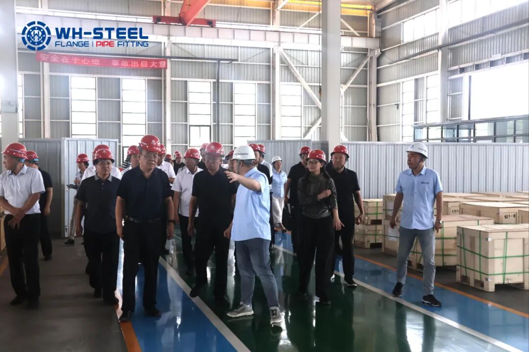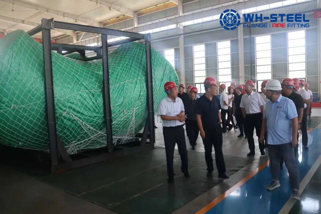 During the research, Mr. Zhang Xiaoxiong introduced information about WH-STEEL Pipeline's production capacity and industry development to the research team. Inside the workshop, the large-sized butt-welded elbows with DN2300 and a wall thickness of 17.48mm were under production. With a diameter of 2.3 meters, these elbows have high requirements for material strength, forming precision, and equipment performance. The smooth production of such large-sized pipe fittings also reflects WH-STEEL's strong industrial capabilities.